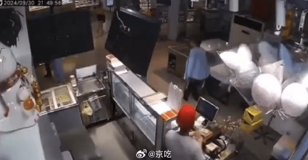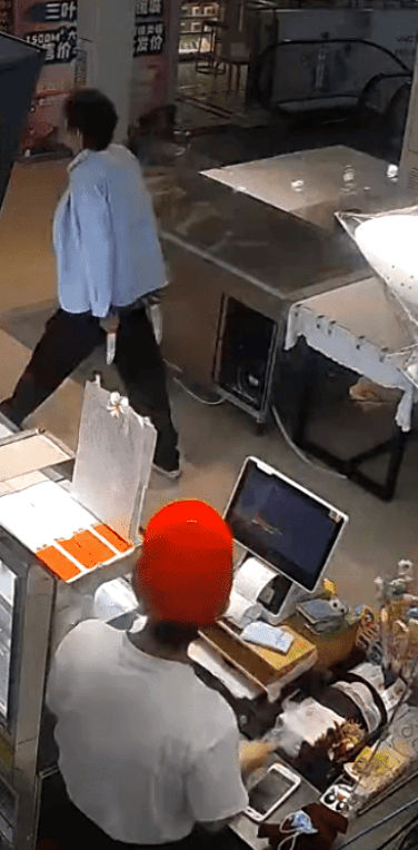 ▲其中一段影片是超市内的闭路电视画面,疑凶敞开恤衫、双手垂直持着尖刀,一脸怒气地在超市走动,旁边的收银员定睛望着他。 微博图片