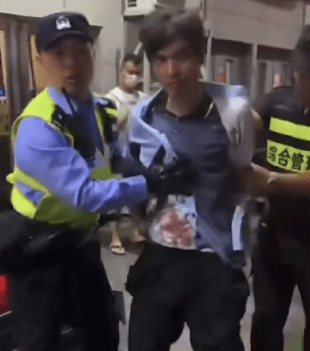 网上另有图片显示,一名男士胸部流血,身上T恤整块左下部份染红,他右手掩胸,能自行站立。