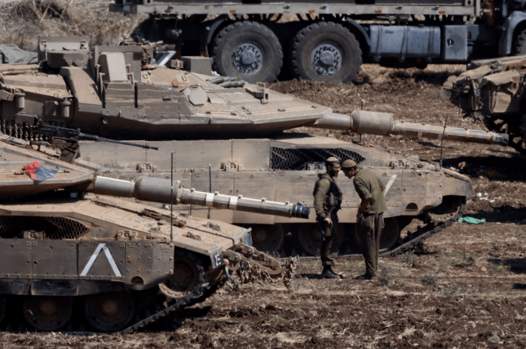 ▲2024年9月30日,在以色列北部真主党和以色列之间的跨境敌对行动中,以色列军人站在装甲车旁。 路透社
