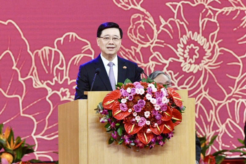 升旗仪式结束后,特区政府于会展大会堂举行国庆酒会,行政长官为酒会主礼。在酒会上,李家超致辞指出,今日是中华人民共和国成立75周年大日子,是特区完成23条本地立法宪制责任及历史使命后首个国庆日,亦是完善地区治理、重塑区议会后首个国庆,很高兴与大家在这个具特别意义的时刻共聚一堂。