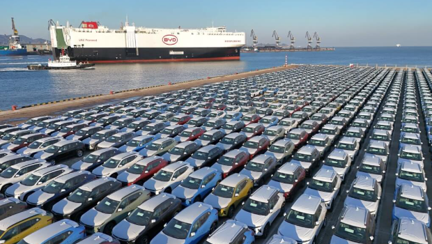 ▲山东烟台港的比亚迪货船和准备出口的电动车。(中新社)