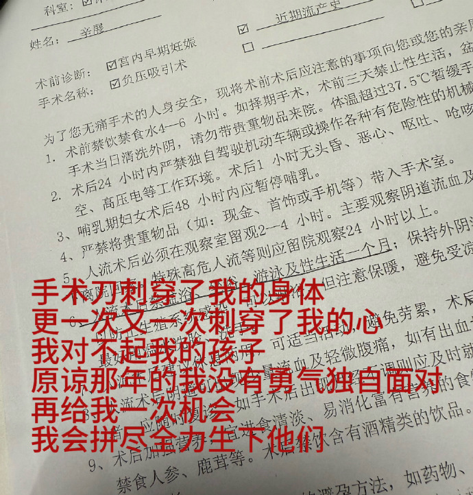辛雨锡发了千字文,更贴出流产手术的证据,并写上:“手术刀刺穿了我的身体,更一次又一次刺穿了我的心,我对不起我的孩子,原谅那年的我没有勇气独自面对,再给我一次机会,我会拼尽全存生下他们。” 而另一张超声波上,辛雨锡又写上:“背叛我的日日夜夜,想起两个孩子你能安枕无忧吗? 他们会帮着妈妈一直盯着你,誓言苍白可我相信举头三尺有神明,天理昭昭必有报应。