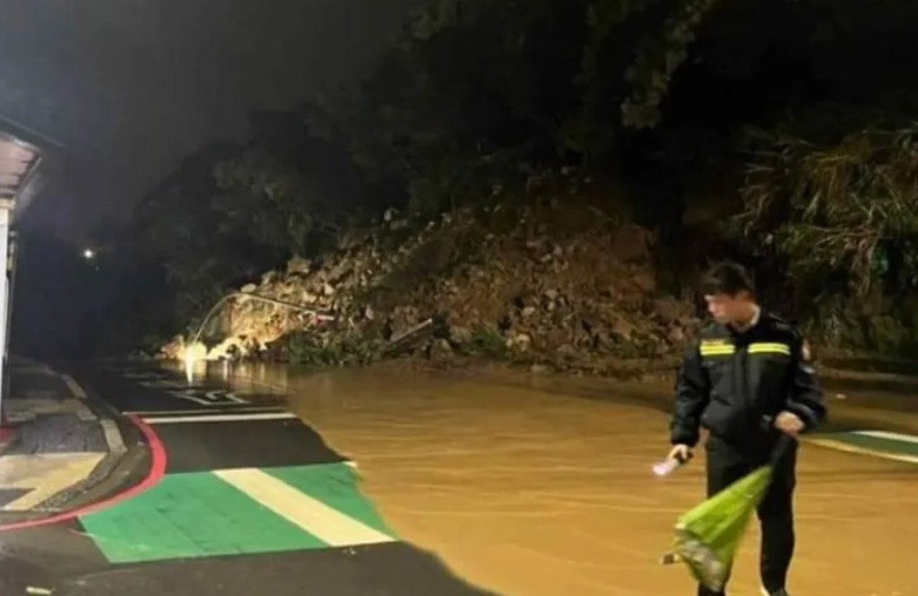 基隆地区凌晨持续强降雨,附近住户凌晨突然听见“轰隆轰隆”声响后,山坡上大批土石瞬间崩落,位置就在海中天社区前方道路,树木夹杂黄泥倾泄而下,道路旁汽机车瞬间也遭到埋没,居民吓得立刻报警。