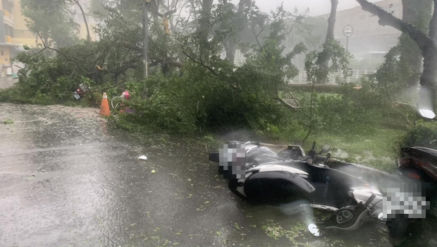 ▲高雄市三民区大中一路口巷行道树和机车被吹垮,数辆机车被压在树下。中时网