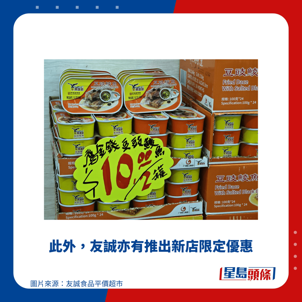 深水埗店同样主打优惠价货品,抵买推介包括公仔点心任选3包$35、同珍蚝油$10枝、越南牛肉河粉杯面$5等。此外,友诚亦有推出新店限定优惠,那川高山白茶、青柑普洱、原沏乌龙茶3支仅售$10,不妨趁今个周末到平价超市选购心宜货品吧!