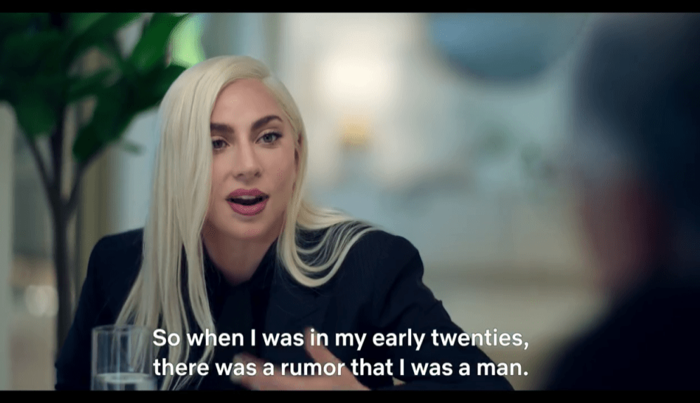 Lady Gaga一向风格偏锋,造型奇特多变,更亦公开接受同志文化。网络多年来一直流传Lady Gaga为变性人(跨性别人士),网上甚至流传其男性形象照片,同时亦有传Lady Gaga是雌雄同体的双性人。一直未有未公开回应与否认有关传闻的Lady Gaga,近日于Netflix纪录片《下一步?与比尔盖茨探索未来》(What's Next?The Future with Bill Gates),首次公开回应该传闻。