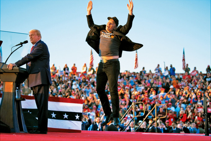 电动车大厂特斯拉(Tesla)行政总裁兼社交平台X的老板马斯克,一身黑色装束在讲台跳起来,高举双臂展现热情。他在台上强调,对一个人性格的真正考验,是他们在“战火”下的表现,警告“如果特朗普没有获胜,这将是最后一次选举”,强调微小的差距也可能决定宾州等摇摆州的选举结果,喊话选民要登记投票。他戴上黑色棒球帽,上面有特朗普竞选口号“让美国再次伟大”,也以黑色呈现,似暗示他的讲话充满警世意味。
