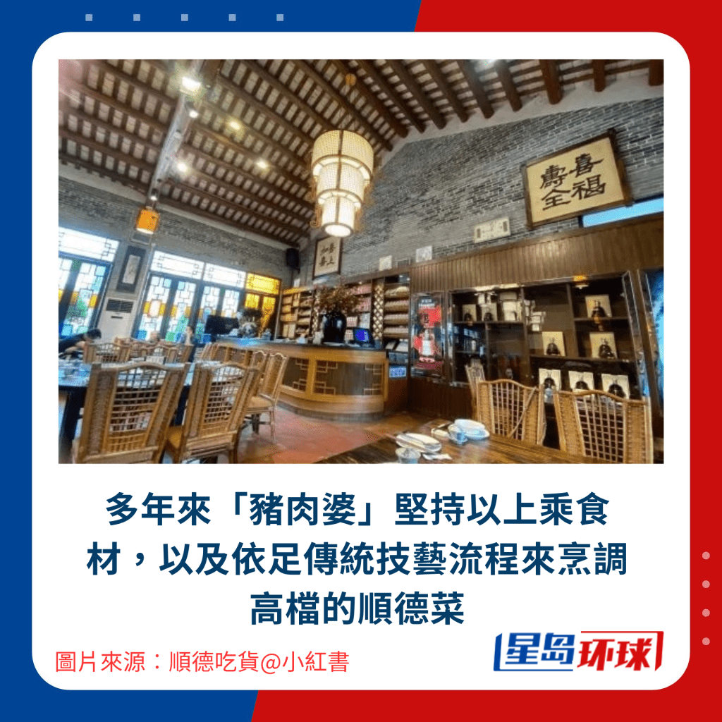 多年来“猪肉婆”坚持以上乘食材及依足传统技艺流程来烹调高档的顺德菜,对菜式出品、环境卫生及服务非常严格,就连铺面装修也讲究,是走岭南园林风格,一室青墙红地砖、小桥流水,还有鱼儿在水中游,古朴别致。而其招牌菜就有银杏胡椒猪肚汤、烧鹅、钵仔柚皮、捞起鱼生、美极干煎罗氏虾等。