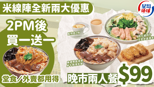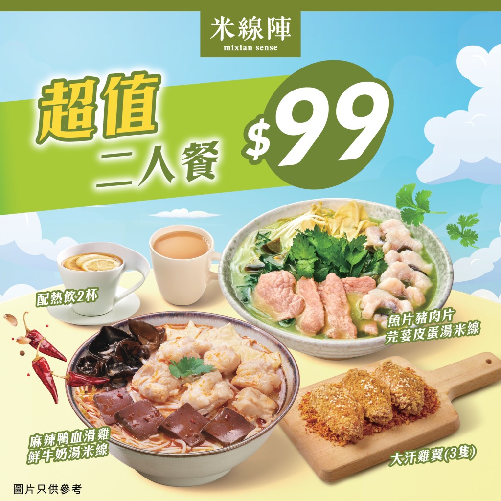 除了买一送一优惠外,米线阵亦有推出抵食二人餐优惠。于晚上6时到米线阵门店(九龙站分店除外)点选堂食及外卖自取,以$99购买“超值二人餐”,套餐餐包括麻辣鸭血滑鸡鲜牛奶汤米线及鱼片猪肉片芫荽皮蛋汤米线各一客、大汗鸡翼3只及热饮2杯。