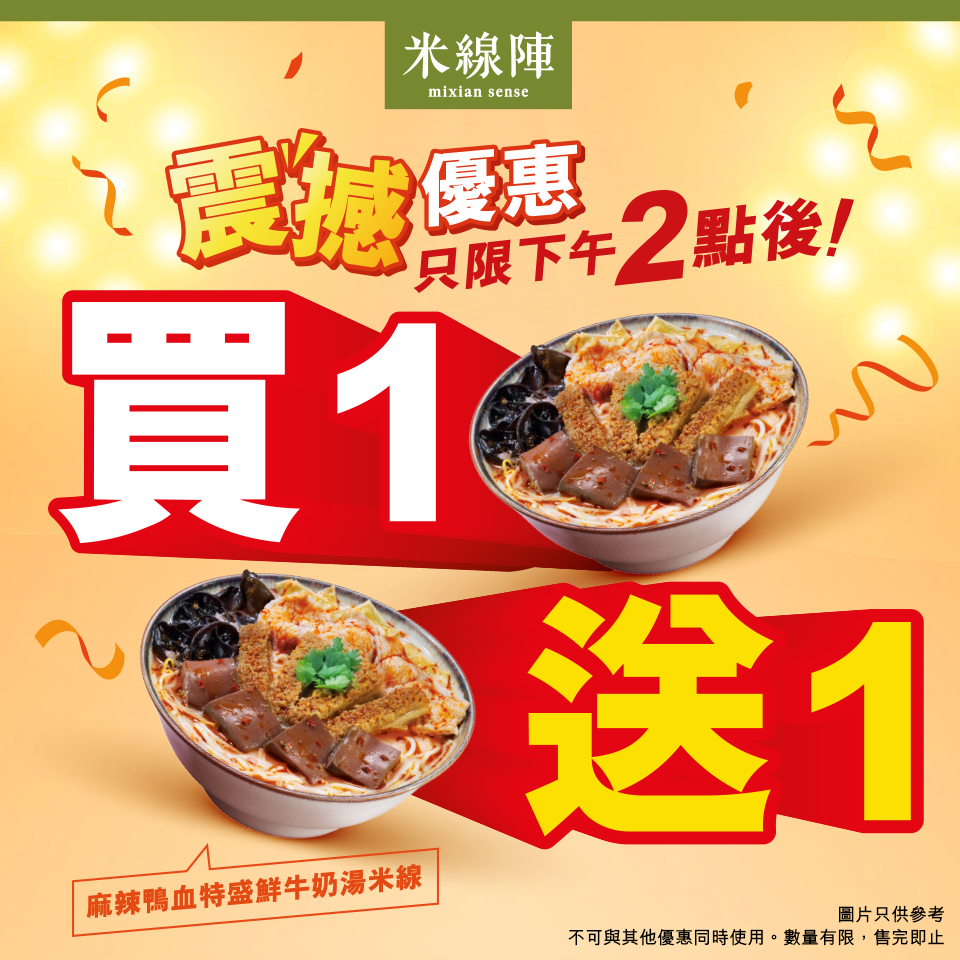 即日起至10月11日,顾客凡于下午2时后到米线阵任何一间分店,即可享“麻辣鸭血特盛鲜牛奶汤米线”买一送一优惠,$58就可以叹到两碗特色米线,平均每碗亦只需$29,麻辣汤底结合柔滑的鲜牛奶,再搭配鸭血、云耳等丰富食材,形成独特的口感,让人一试难忘!优惠适用堂食、外卖或者外卖自取网上点餐,不妨约上亲友一同品嚐这份独特的滋味。