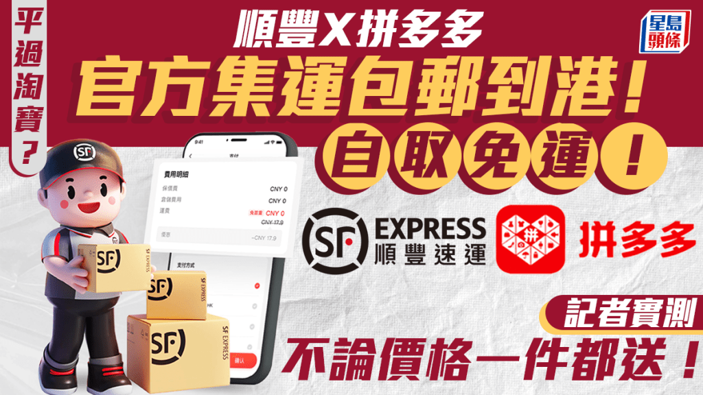 在拼多多APP购物后,选择顺丰的集运服务,即可享受自取免运费的优惠。香港地区拥有超过1,500个自提点,消费者可以24小时随时取件,相当方便。此外,上门配送服务也提供特别的运费优惠,让消费者无需为住宅附加费担忧。《星岛头条》记者今日尝试在拼多多下单购物,已发现有关优惠已经上线,顺丰集运提供的物流选项,均能做到包邮,且不论价格,一件人民币30元的货品,也能享受上述配送优惠。(实测过程见上文图辑)
