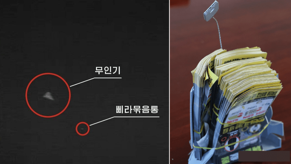 ▲朝鲜公布照片,称韩国用无人机入侵领空,并空投传单。(朝中社)