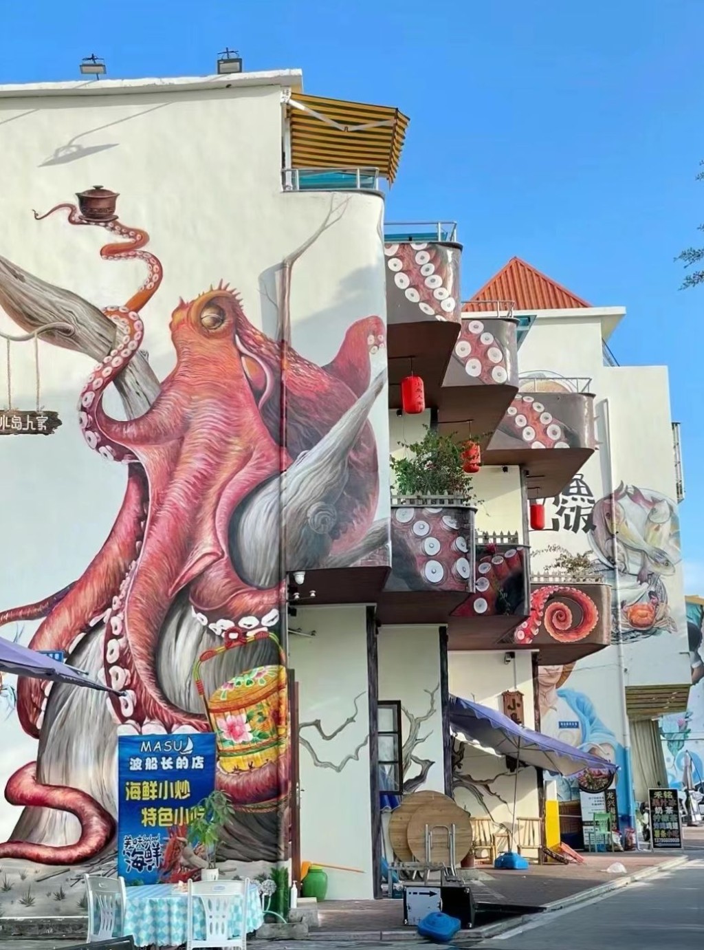 ▲妈屿岛岛上有几家餐厅,除了吃到潮汕美食外,餐厅建筑和涂鸦墙很有异国风情。 (图片来源:小红书@我是风儿)