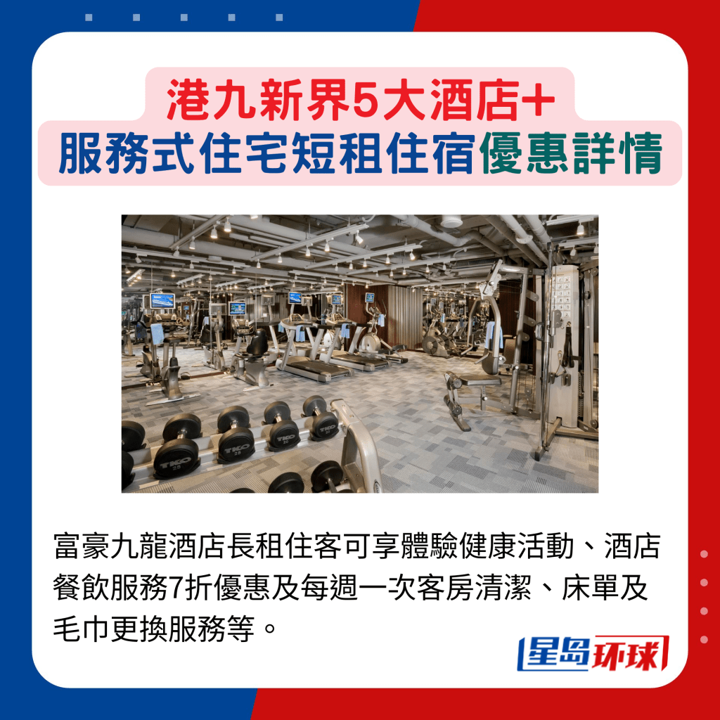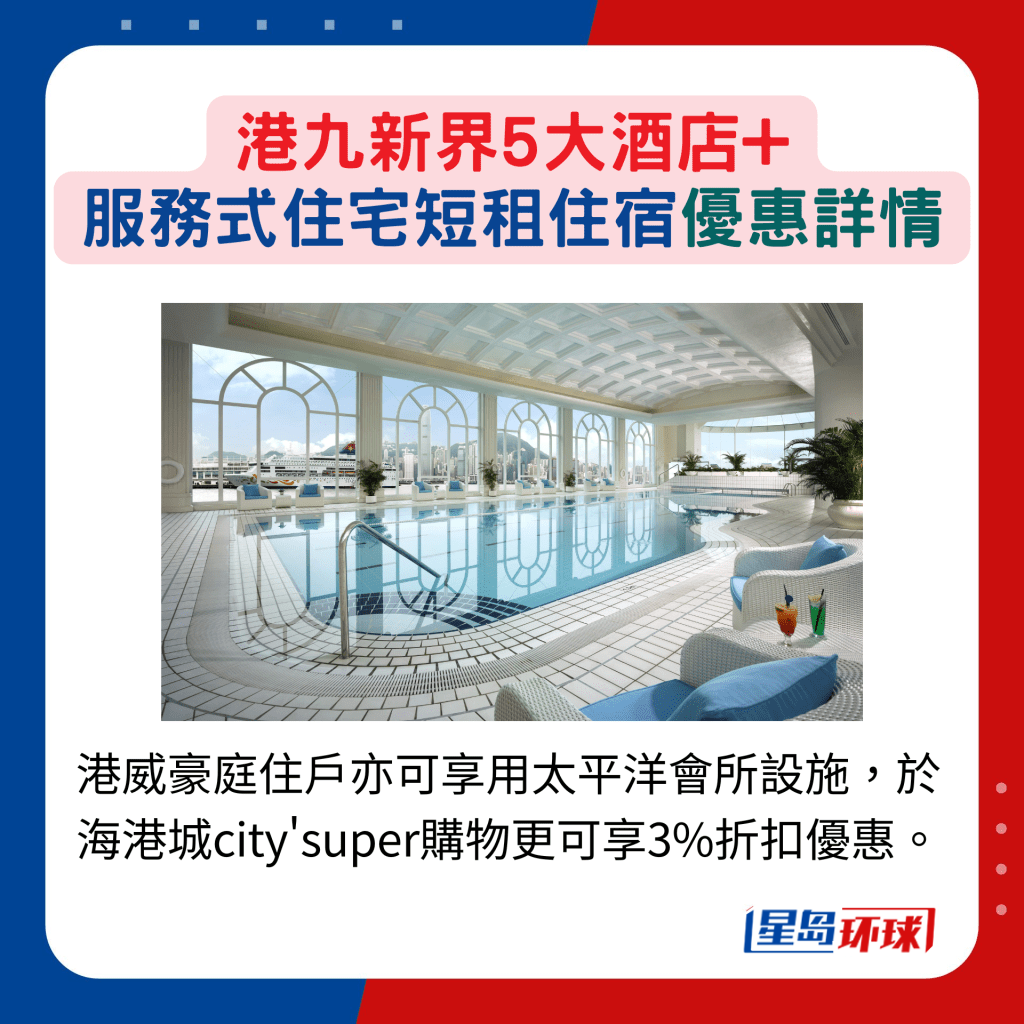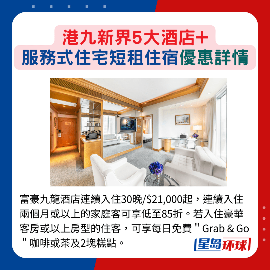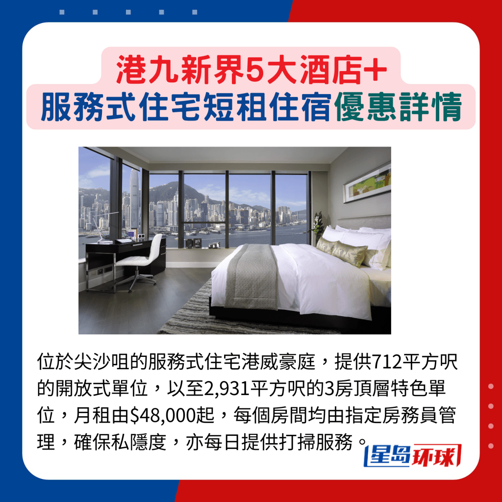 位于尖东的富豪九龙酒店亦有提供连续入住7晚、14晚及30晚的短租选择,若挑选豪华客房或以上房型,均可免费获每日"Grab & Go"咖啡或茶及2块糕点,以及体验健康活动等。若入住家庭客房(高级豪华客房)或以上房型连续两个月享9折,连续三个月则享85折,换言之,住宿时间越长越抵住! 同样位于尖沙咀的服务式住宅港威豪庭,提供712平方呎的开放式单位,以至2,931平方呎的3房顶层特色单位,每个单位均由指定房务员管理,确保私隐度,亦提供每日打扫服务 (星期日及公众假期除外)。住客更可享海港城city'super专属优惠,最适合爱购物一族。