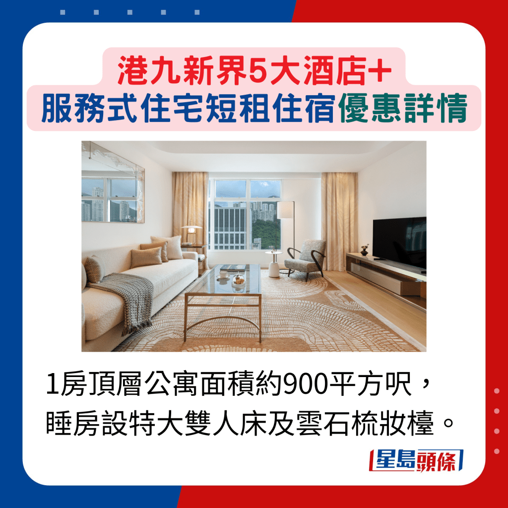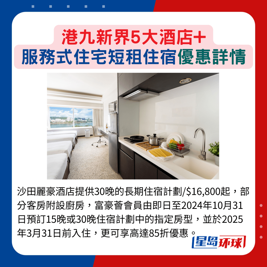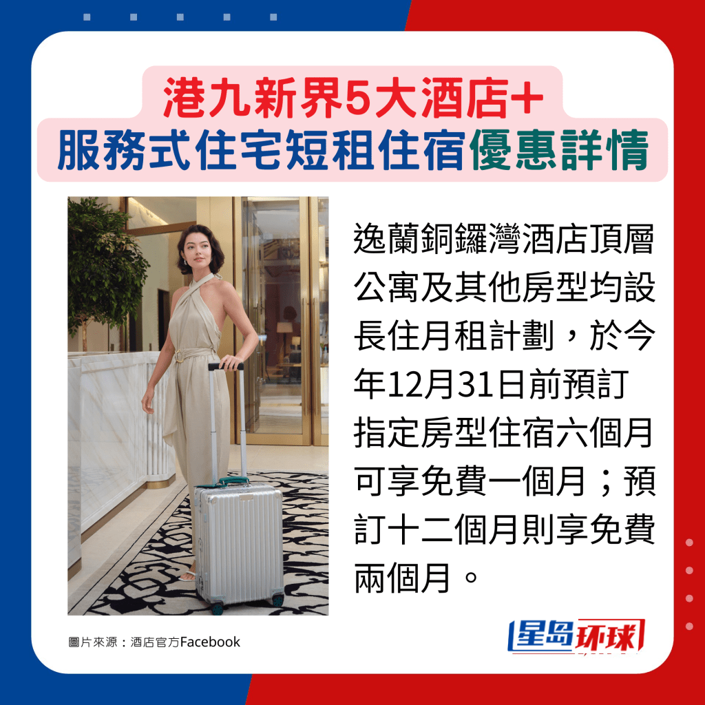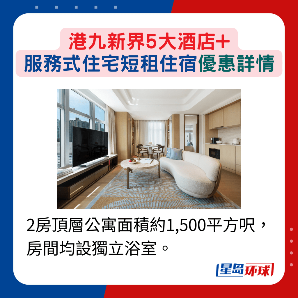 位于尖东的富豪九龙酒店亦有提供连续入住7晚、14晚及30晚的短租选择,若挑选豪华客房或以上房型,均可免费获每日"Grab & Go"咖啡或茶及2块糕点,以及体验健康活动等。若入住家庭客房(高级豪华客房)或以上房型连续两个月享9折,连续三个月则享85折,换言之,住宿时间越长越抵住! 同样位于尖沙咀的服务式住宅港威豪庭,提供712平方呎的开放式单位,以至2,931平方呎的3房顶层特色单位,每个单位均由指定房务员管理,确保私隐度,亦提供每日打扫服务 (星期日及公众假期除外)。住客更可享海港城city'super专属优惠,最适合爱购物一族。
