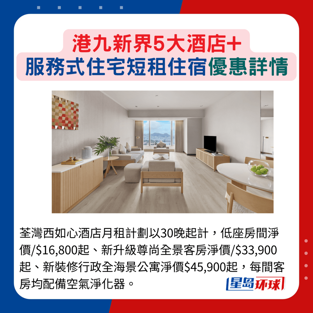 不论是家居装修还是到港商旅,需要至少连续数周或以上的短租住宿,酒店及服务式住宅都是热选。除了地点及交通是 优先考虑,追求优质起居生活的话,设施、餐饮,甚或宠物友善服务等同样重要,香港不同地区都可找到提供免费早餐、健身课堂、购物着数,以至连续住宿折扣等优惠的酒店。今日就为大家推介5间分别位于港、九及新界的高性价比优质选择。