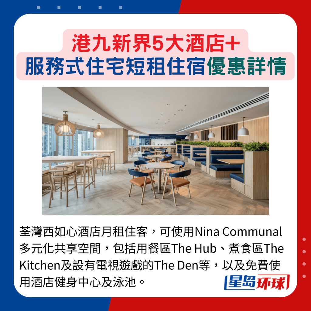 最近完成设施升级的荃湾西如心酒店除提供低座房间外, 还包括可作短期租住的全新升级尊尚全景客房及行政全海景公寓,住客同时可享全新的Nina Communal多元共享空间,包括煮食区The Kitchen及设有电视游戏 的The Den等,享受Me Time, 另可免费使用酒店健身中心及泳池。另外,每间客房都配备空气净化器,十分贴心。 至于沙田丽豪酒店同样提供 免费共享空间、健身中心及室外游泳池。另提供24小时自助洗衣及干衣服务,代用币买一送一。 富豪荟会员由即日至2024年10月 31日预订15晚或30晚住宿计划中 的指定房型,并于2025年3月31日 前入住,更可享高达85折优惠。