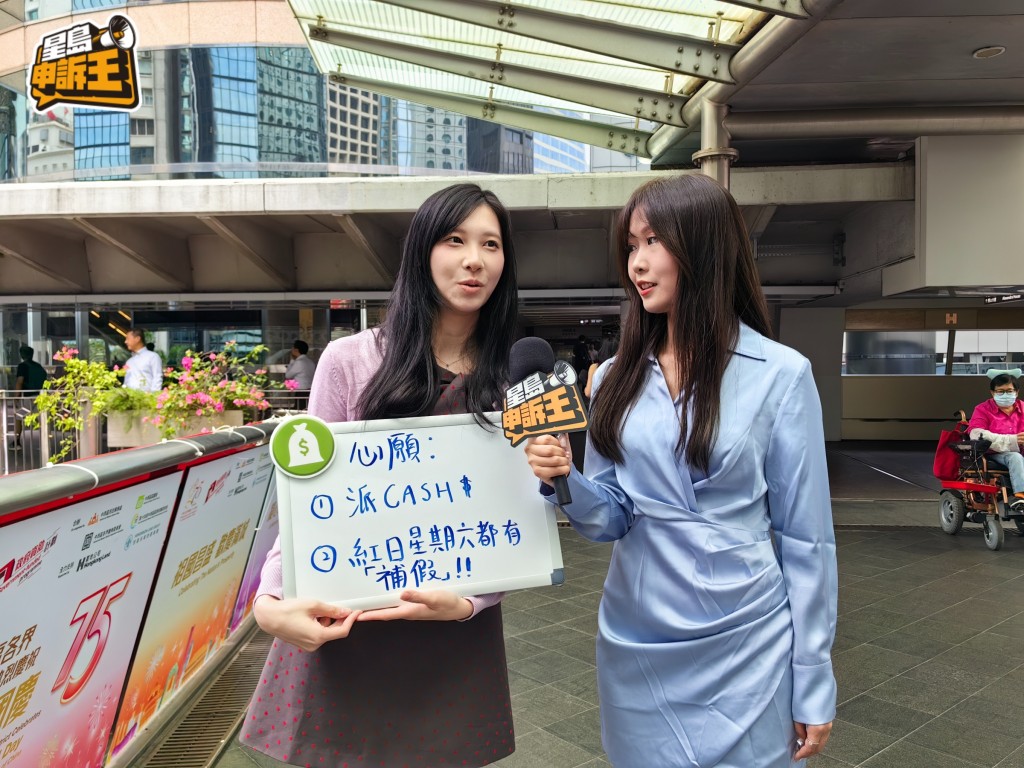 《星岛申诉王》主持衍妤到中环访问打工仔,听听他们对《施政报告》的心愿。靓女OL张小姐期望政府直接派现金,代替消费券。她指,去年很多公众假期都撞正星期六,不能补假,直言“打工仔好蚀底”,希望政府设立星期六遇上公众假期时可以补假。