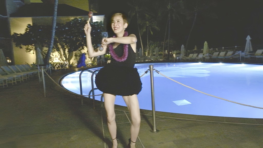 ▲君如一身夏威夷风情打扮的她走到泳池边跳草裙舞“找数”。