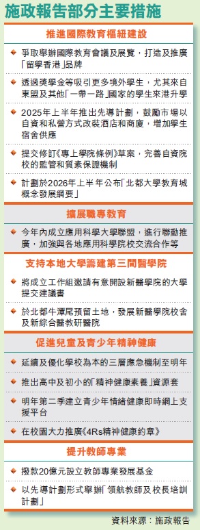 新一份《施政报告》提出要“打造‘留学香港品牌’”,措施包括于明年推出先导计划,鼓励市场以自资和私营方式改装酒店或商厦为学生宿舍,在程序上拆墙松绑。至于去年提出的北都大学教育城,预留用地面积增至最少80公顷。非本地生人数方面,消息人士透露,目前8间资助大学的非本地学士生比例约为23%,又强调40%比例并非“终极”放宽。