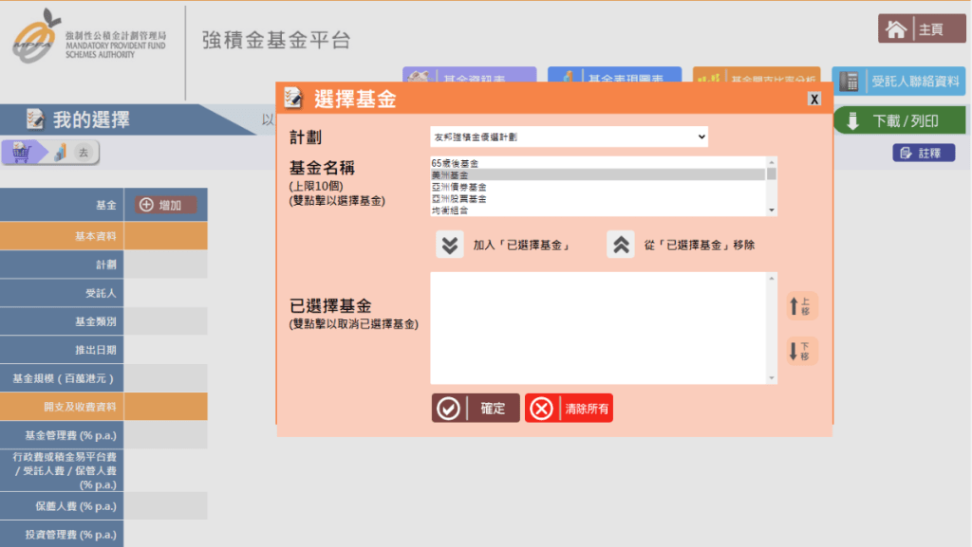 ▲选取“我的选择”,可按需要拣选各计划的各类基金,一并比较。