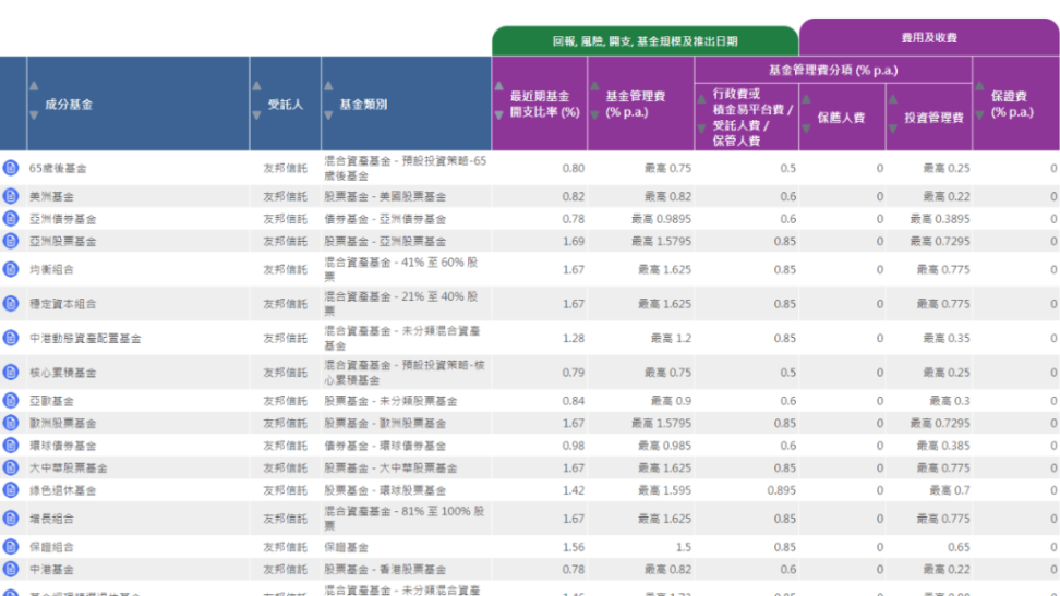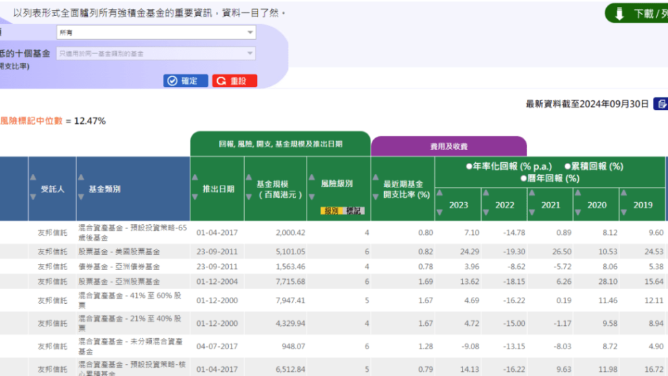 ▲基金资讯表列出现时379只基金资料,可一次过比较其回报、风险、基金开支等资料。