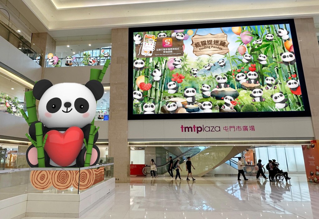 屯门市广场摆放7.5米高巨型毛毛充气熊猫,带同它们最爱的竹子,成为有趣场景,正好让大家一同前来感受熊猫的爱与祝福。 大电视于每日特定时间将会开始“熊猫捉迷藏”互动游戏,顾客可以透过手机应用程序答中问题,即有机会获得熊猫造型礼品、香港富丽敦海洋公园酒店餐饮券及商户优惠券等。