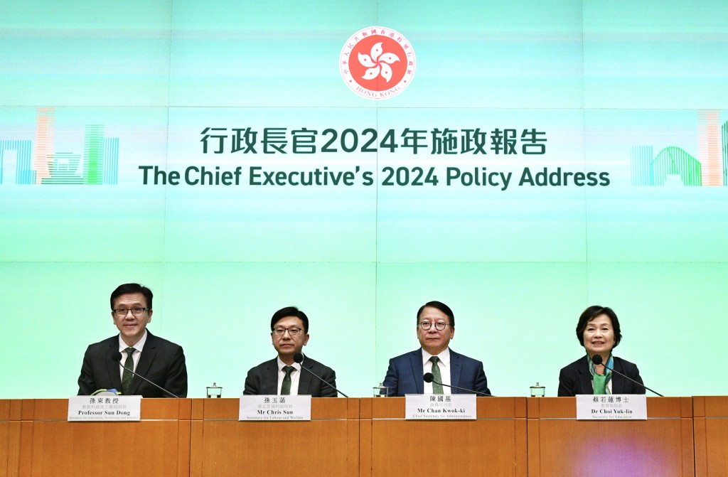 施政报告2024︱新一份《施政报告》中,提出将香港打造为“国际高端人才集聚高地”,政务司司长陈国基今日联同创新科技及工业局局长孙东、劳工及福利局局长孙玉菡、教育局局长蔡若莲(18日)出席记者会时指出,截止今年9月底,各项人才计划已收到36万个申请,其中24万已批出,有16万的人才连同家人已赴港,超额完成当局目标。