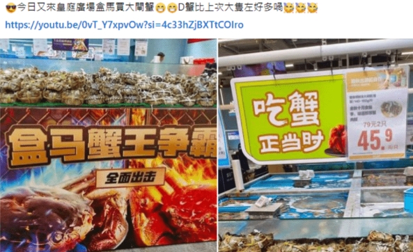 ▲日前有网民在facebook群组“深圳吃喝玩乐资讯关注组”上发文,分享在皇庭广场盒马购买大闸蟹的体验