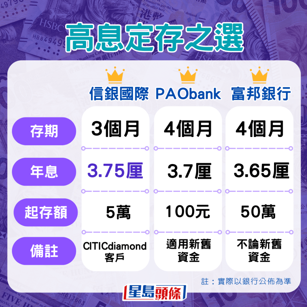 至于一般客户以5万元或以上新资金承造3个月、6个月及12个月期息率,分别为3.7厘、3.4厘及2.95厘;若为旧资金的话,上述年期定存息率将分别降至3.45厘、3.35厘及2.9厘。