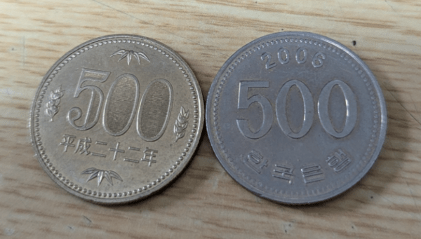 500韩元与旧版500日元硬币在直径、重量及材质上极为相似,容易混淆。虽然日本在2021年推出新版500日元硬币,但旧版仍广泛流通,令这种混淆情况未能完全避免。