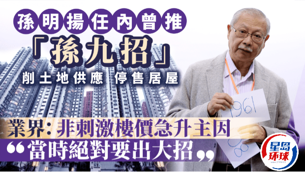 提到“孙九招”,汪敦敬认为在2002年至2003年大时代,“这是当时局长必需要做的事情”,而孙明扬推出了一篮子房屋政策,为当时楼市解决部份隐忧。不过,“孙九招”当中,以取消拍卖土地的措施最为人诟病,被指将土地供应的主导权拱手相让予发展商,加上新落成单位数量大减,在供应短缺下大幅推高楼价和租金。