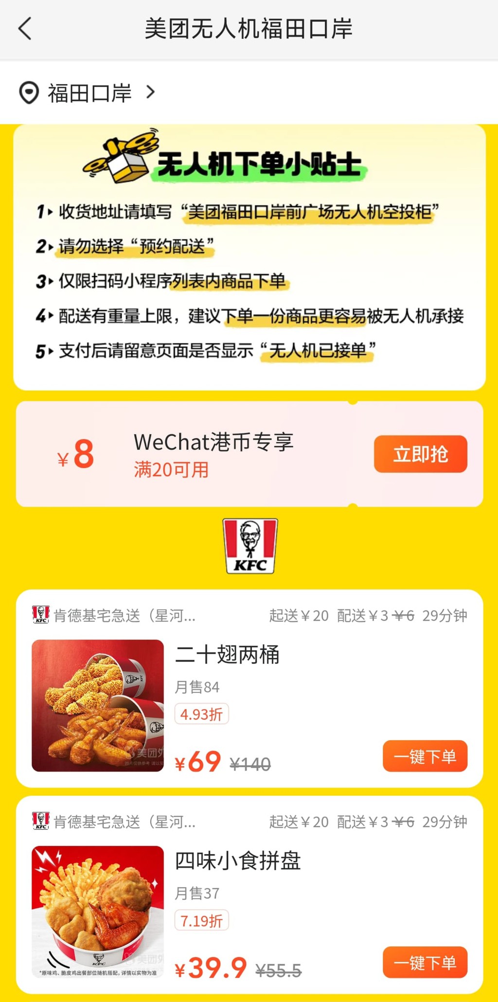 该条新配送航线可支持香港手机号码登记的微信和美团应用程序(APP)下单及取货,美团无人机亦与微信港币钱包(WeChat Pay HK)合作,在该航线推出异地下单及港币支付的新模式,即港人北上过关前已可在香港通过美团App或美团无人机小程序提前下单,到达福田口岸时即可前往智能空投柜取走心仪商品,从下单到取外卖最快仅需10分钟。