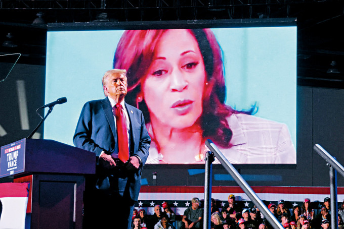 ▲特朗普上周五在密歇根州底特律造势时,屏幕播出哈里斯的面容。