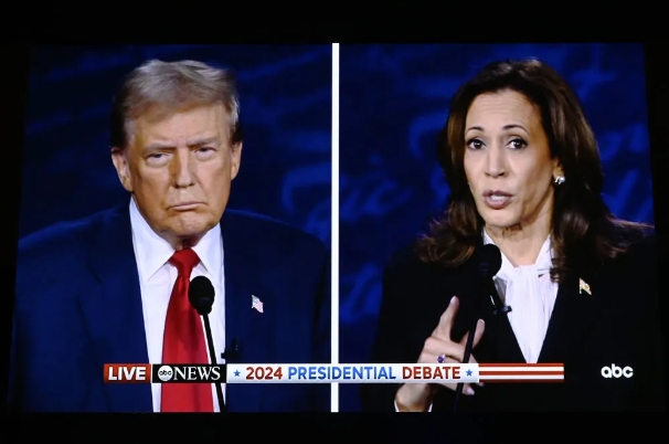 ▲这张9月10日的视频直播画面显示,哈里斯(右)和特朗普在费城参加电视辩论。新华社
