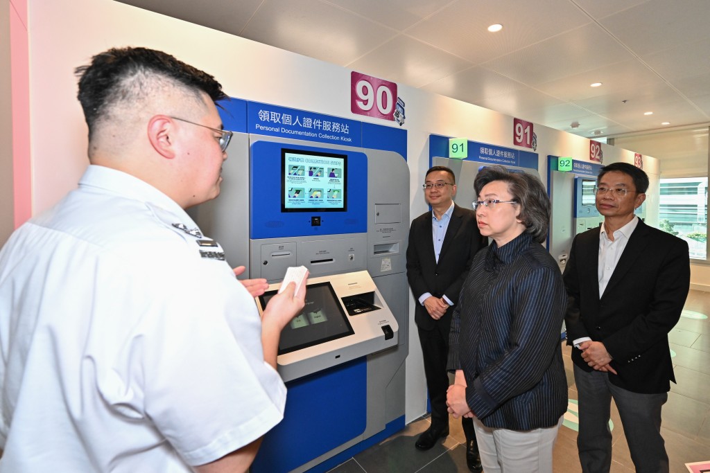 她随后参观人事登记办事处,入境处职员向她介绍入境处总部的自助个人证件服务。全新的“申请个人证件服务站”现时让市民自助申请特区护照,未来更将会首次引入自助申请身份证的服务,省时便捷。“领取个人证件服务站”则整合了现有各种领取证件服务站的功能。新设置的服务站进一步方便市民以自助形式办理个人证件的申领手续,借以提供更优质的公共服务。