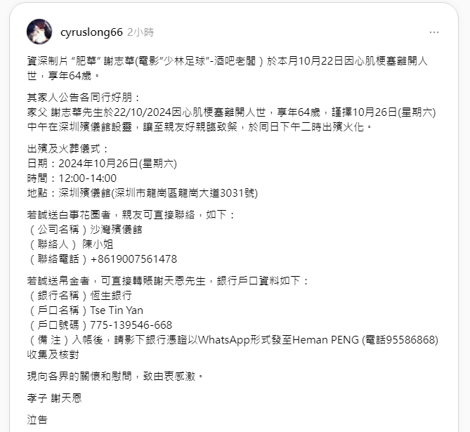 谢志华儿子谢天恩透过友人,昨日于社交平台Threads转发讣闻,公布丧礼详情,订于10月26日12时在深圳殡仪馆设灵,并于同日下午2时出殡火化。此外,花圈另有查询热线安排,帛金可直接转账谢志华儿子谢天恩户口。最后,谢志华儿子谢天恩感激各界的关怀和慰问。