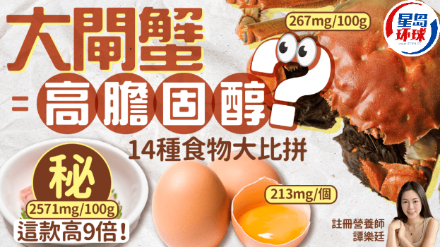 秋天是吃蟹的季节,谁可抗拒甘香肥美的大闸蟹?但不少人都会担心胆固醇的问题。注册营养师谭乐廷列举14种常见食物的胆固醇含量,其中一款至比大闸蟹高逾9倍!她又教大家食蟹5大宜忌,让大家吃得安心。