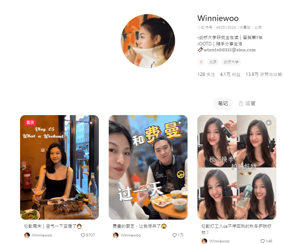 翻查Winniewoo的小红书,她是一名剑桥研究生,在外地时已开始经营自己的频道,分享生活点滴及美妆之道,而近日回到国内,便实时找当年好友吴费曼拍片。从Winniewoo的照片可见,她长发披肩,上围丰满,皮肤白晢,整体甚有气质。