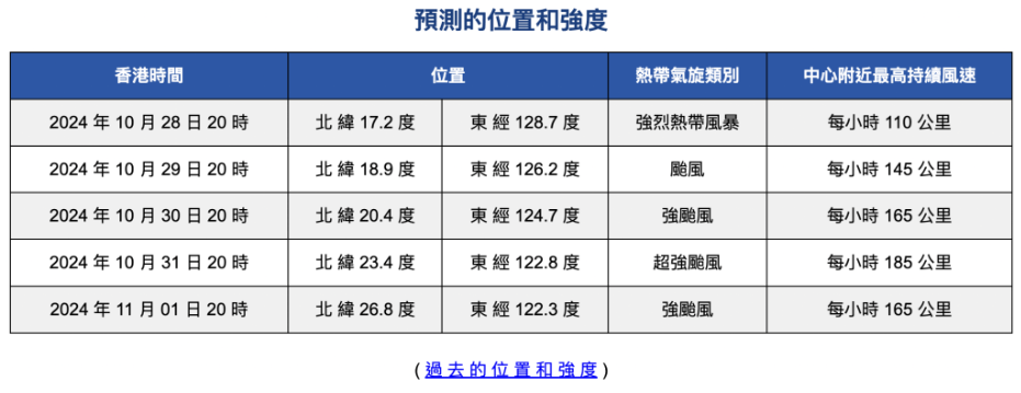 ▲天文台提供的图表显示,康妮周二会升级台风,周四更升至超级台风。