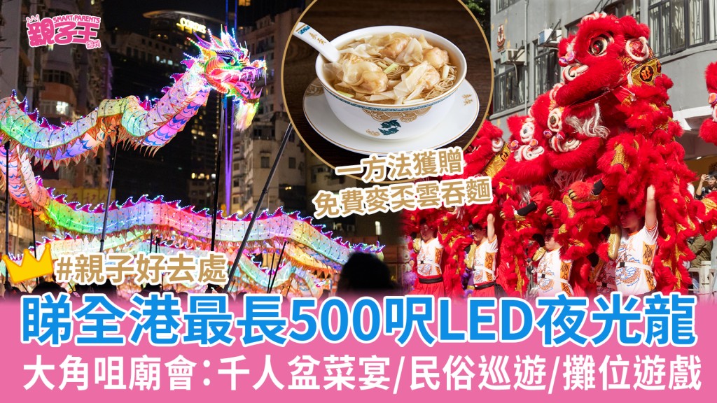 不一定农历新年、中秋才有机会睇舞龙,于11月3日在大角咀福全街一带举行的“大角咀庙会”,也有机会近距离一睹威武夺目的夜光龙。 活动由上午起进行,重点活动包括庙会特色巡游、十八只醒狮梅花桩表演、时装巡礼、千人盆菜宴,以及晚上压轴出场的香港最长 500呎 LED 夜光龙及国家级非物质文化遗产的“沙头角鱼灯舞”表演。