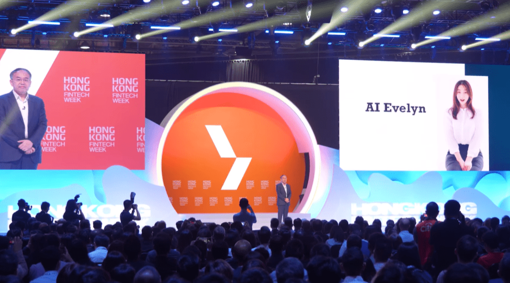 ▲许正宇演讲期间与AI Evelyn互动,AI Evelyn讲述对香港作为国际金融中心、未来人工智能发展等看法。 (财库局影片截图)