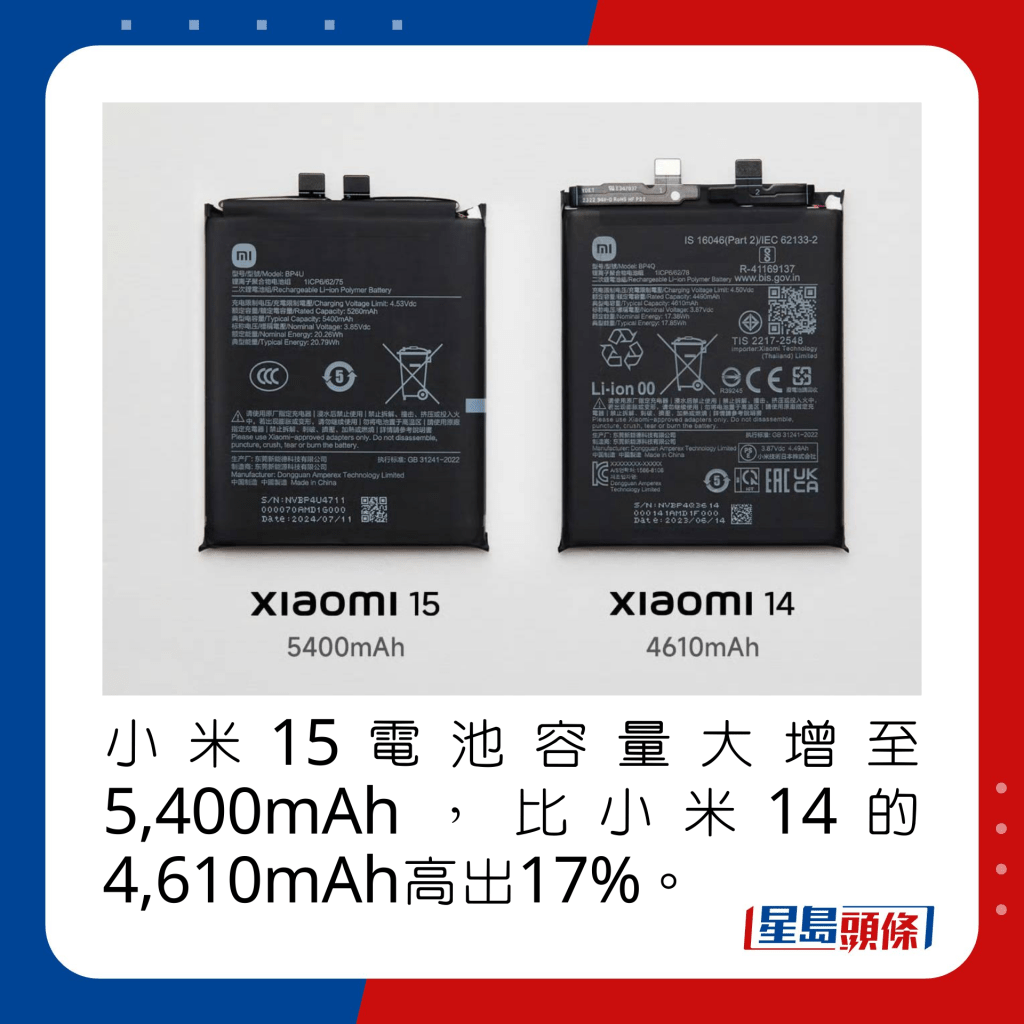 多得Snapdragon 8 Elite的双超大核及PC级架构,加上加码至12GB RAM起跳,配合自家HyperCore加持,CPU效率大幅提升,长时间玩大型游戏亦可保持高帧率及低功耗。效能以外,小米15另一重磅升级是金沙江电池能量密度提升至850Wh/L,令电池容量由小米14的4,610mAh大增至5,400mAh,加上HyperOS 2优化,续航力较上代提升23%,且支援90W有线及50W无线快充。