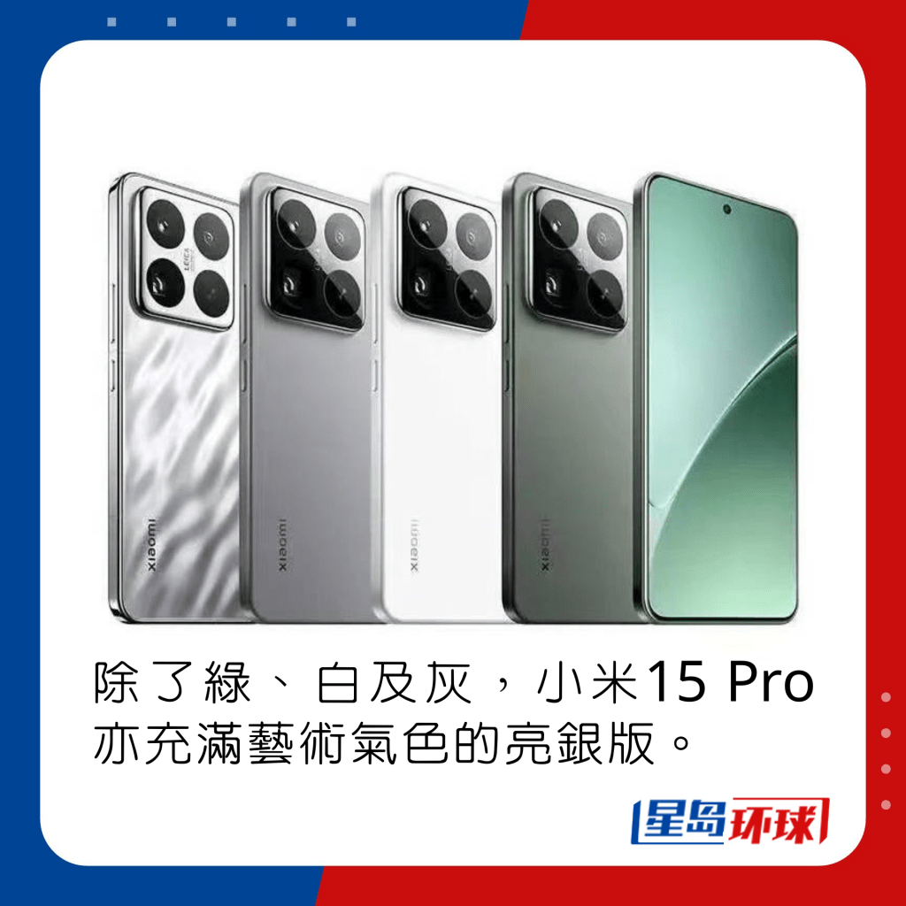影拍方面,小米15配备Leica高速3镜,分别是50MP广角主镜、50MP超广角及50MP远摄,其中远摄光学变焦则由上代3.2×减至2.6×,并提供5×无损变焦及10cm微距拍摄。大概是小米15小巧机身以女士为对象,厂方特地推出可从20种配色及黑白边框自选组合的订制版之外,更有用上鳄鱼纹理及边框镶有培育钻石的限定版。
