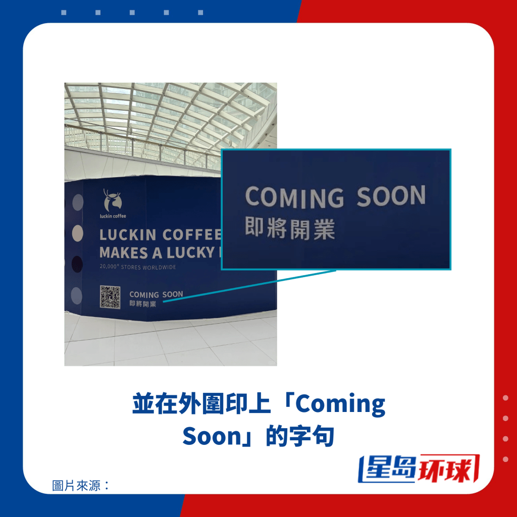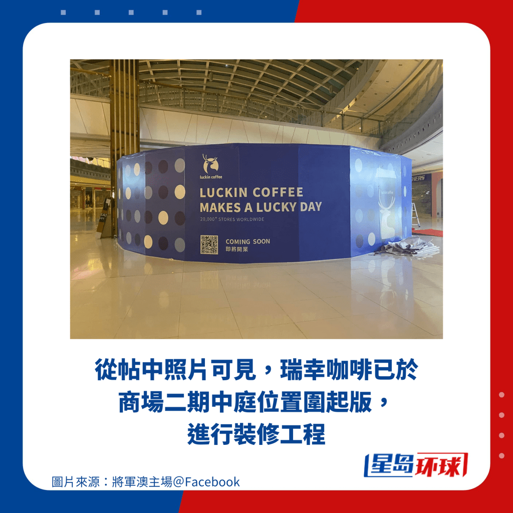 今日(30日),有网民在Facebook群组“将军澳主场”发帖,指新都城中心“又多一间内地牌咖啡店”,瑞幸咖啡已于商场二期中庭位置围起版,进行装修工程,并在外围印上“Coming Soon”的字句,预告店铺即将开业的消息。