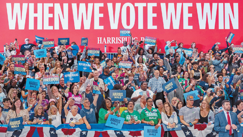 最新民调显示,民主党总统候选人哈里斯在密歇根州与威斯康辛州的形势略为乐观,但在重中之重的宾州,与共和党对手特朗普依然势均力敌。