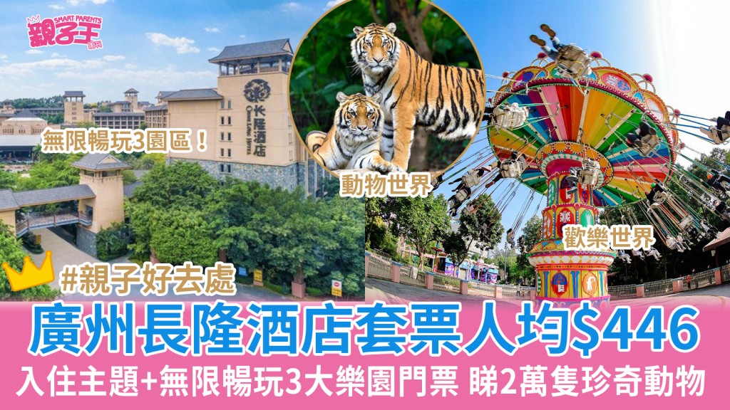 爸妈想轻轻松松不需计划行程跟小朋友玩两天? 广州长隆是个好选择。 广州长隆园区分有广州长隆野生动物世界、广州长隆国际大马戏、广州长隆欢乐世界、广州长隆水上乐园(每年4至10月开放)、广州长隆飞鸟乐园,包围园区有多间酒店,今次有优惠的广州长隆酒店设有专为小童设计的探趣套房和配套,优惠将包入住狩猎房,让小朋友可以于假期与自然亲密接触。