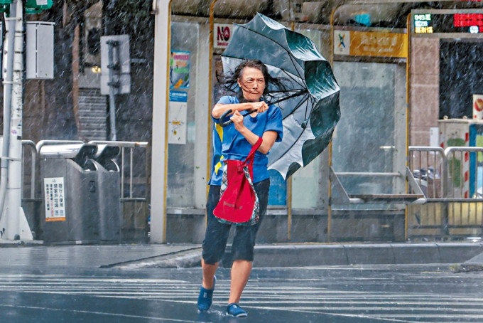 ▲台北民众撑伞对抗强风大雨。