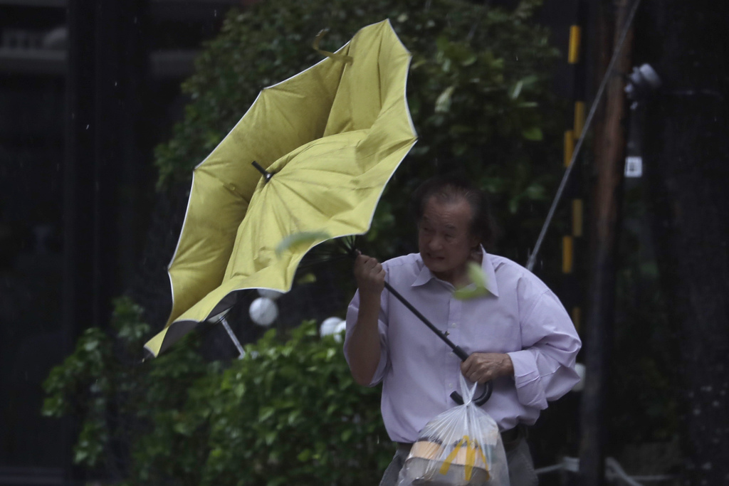 ▲强台“康妮”31日午后在台东成功登陆,风强雨骤全台有感。图为台北街头行人雨伞被强风吹到开花的瞬间。(美联社)