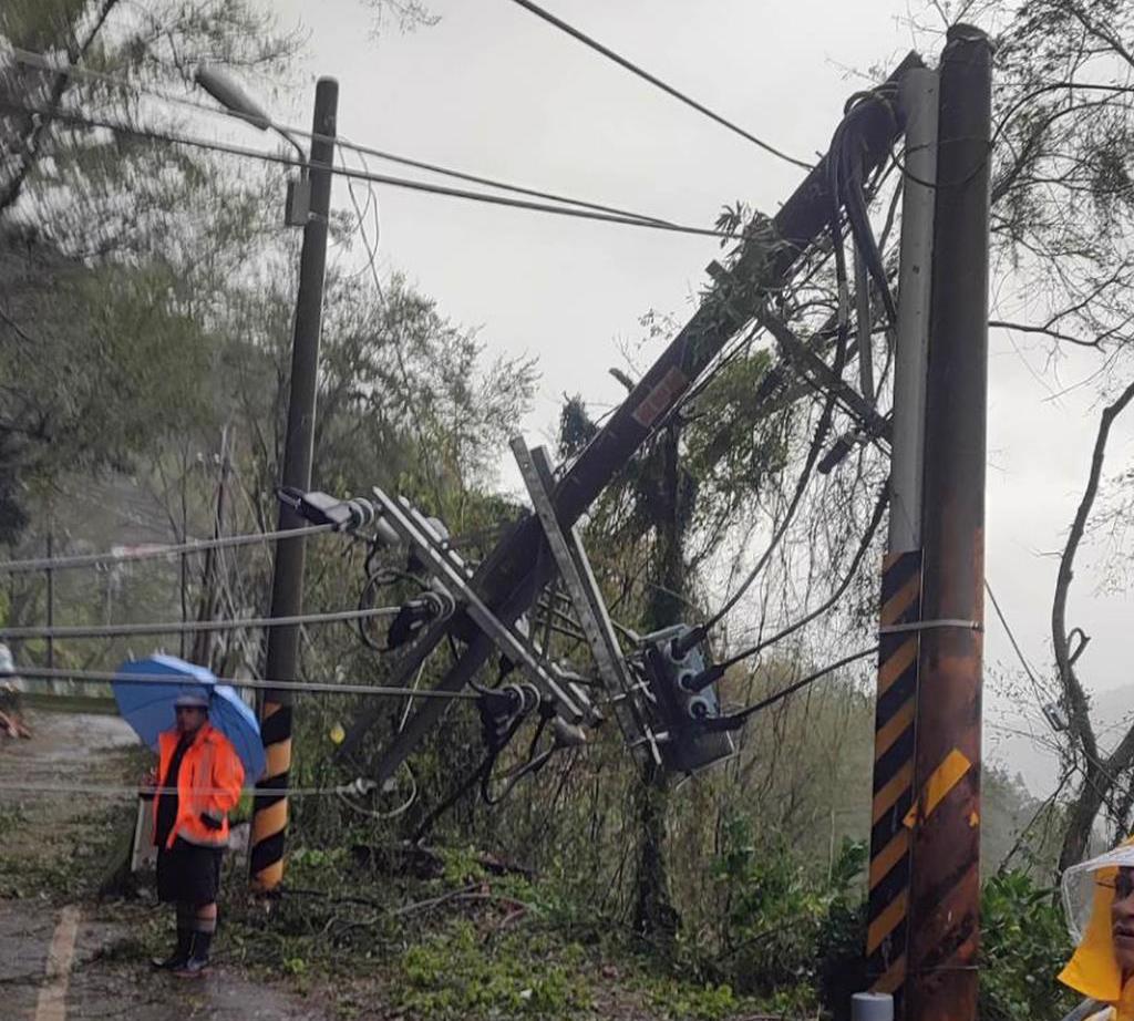 台电台中区处指出,梨山地区目前雨势大,对外联络道路因土石坍方,人车无法通过,上午先由街区往德基(电源端)方向查修,经77K灵甫桥坍方(梨山干#287处)以徒步方式挺进,发现梨山干#228、#234、#242、#251大树压杆线,调派吊臂车及升空车抢修。